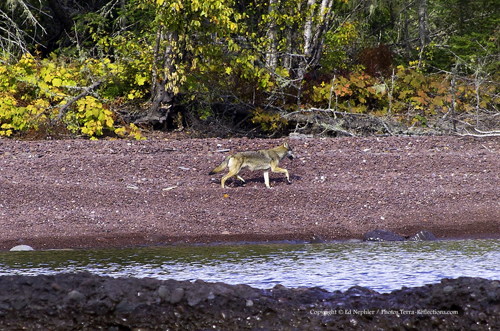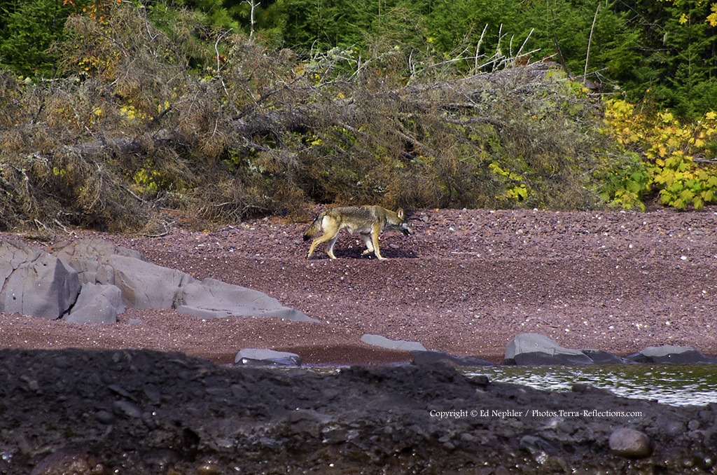 We were setting along the shore enjoying the wonderful view near the rocket launch site at the very tip on the Keweenaw Peninsula. I thought it would be a good time to get moving, but as I stood up, something caught the corner of my eye. Looking across a small bay I saw it…a wolf. Thoughts were running through my head, photos, gather the dogs, shit, photos, gather the dogs, shit. We were able to get the dogs on their lead’s and I started firing shots off with the camera.